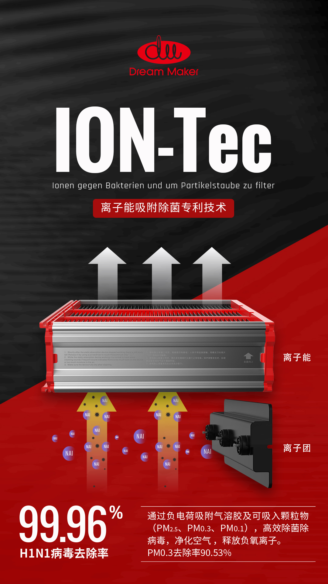 Dream Maker造梦者自主研发的ION-Tec离子能吸附除菌专利技术已广泛应用于Dream Maker系列新风产品,不仅PM0.3颗粒物去除率高达90.53%,对H1N1流感病毒杀灭率更高达99.96%。同时,作为核心过滤模块,离子能可水洗、重复用,降低使用成本。