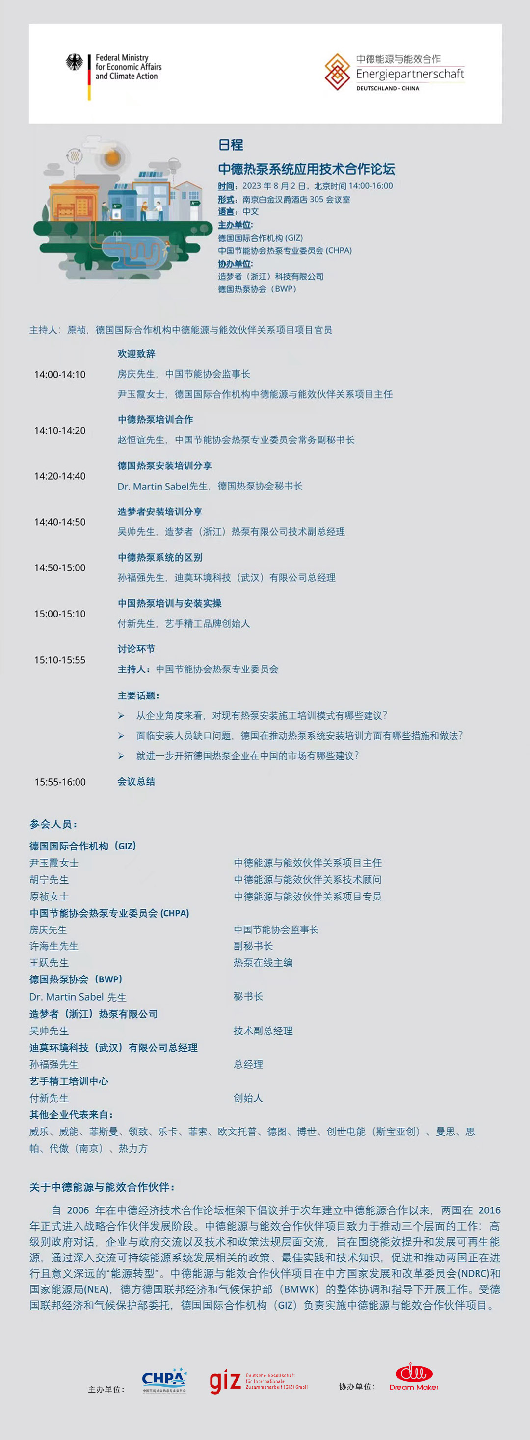 8月2日下午,由中国节能协会热泵专业委员会CHPA和德国国际合作机构GIZ联合主办,Dream Maker协办的《2023中德热泵系统应用技术合作论坛》隆重召开。