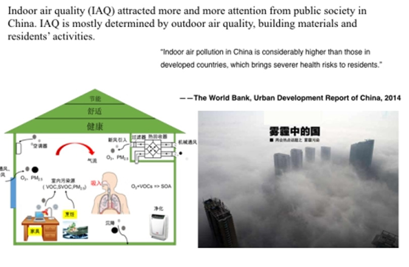 孙贺江副教授的研究项目对放置在近300个住户每个房间的大量传感器数据进行监测,监测项目包括PM2.5、温湿度、二氧化碳、甲醛、TVOC等数据。另外也使用 功率监测模块,对住户的用电情况进行了监测。研究项目把这些数据汇集在一起,通过Wi-Fi网关把数据发送给远程的云端数据库。这是室内空气质量数据的监测。