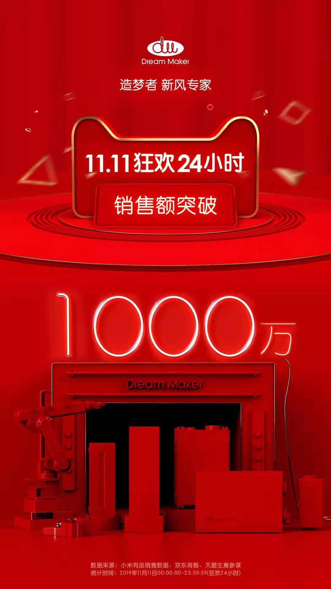 据新风行业领先品牌造梦者披露,其 2019 双十一线上单日销售额超过千万,拿下京东新风品类店铺第一名的成绩,并夺得京东中央新风机销量销售额双冠军。