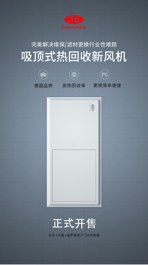 同时,造梦者还发布了创新设计的吸顶式热回收新风机,顾名思义区别于传统“吊顶式”新风机,是由吸顶式净化箱和吊顶主机两个主要部件构成。这种创新设计的核心优势,不仅在于方便用户一键开启净化箱、快速更换滤芯;还在于分体式设计带来更大的空间优势,让新风机在不增加层高占用的前提下,大大增强了过滤能力。一举改变了传统吊顶式新风机耗材维保难、净化能力弱的短板。