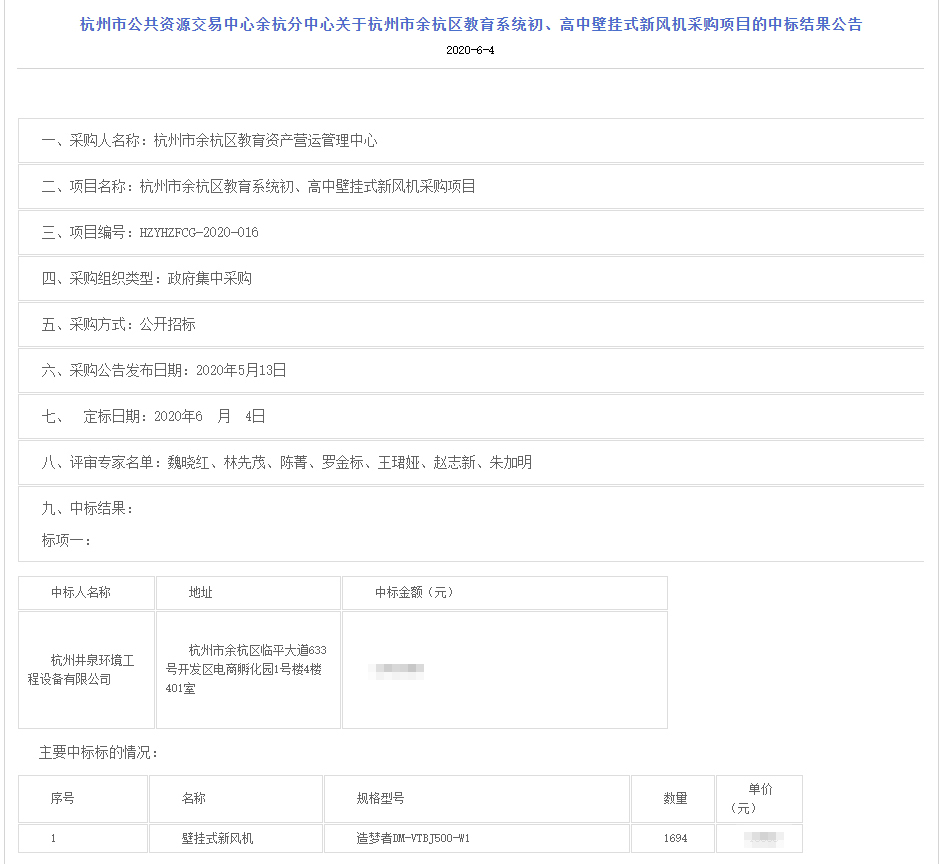 2020年6月4日,杭州市余杭区教育系统初、高中壁挂式新风机采购项目中标结果公示,造梦者DM-VTBJ500-W1壁挂新风机中标!